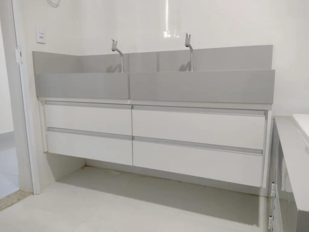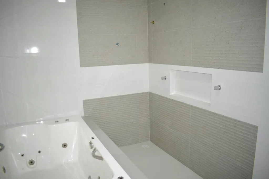 Pavimento superior com 03 suítes sendo uma suíte master com banheira de hidromassagem,02 chuveiros, pia dupla e closet.