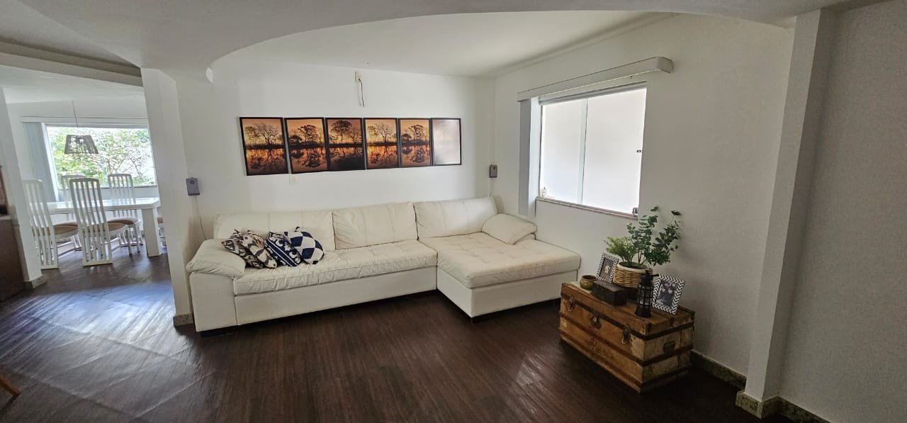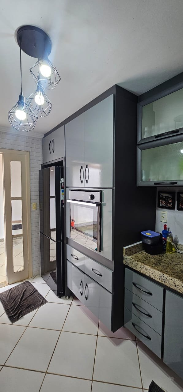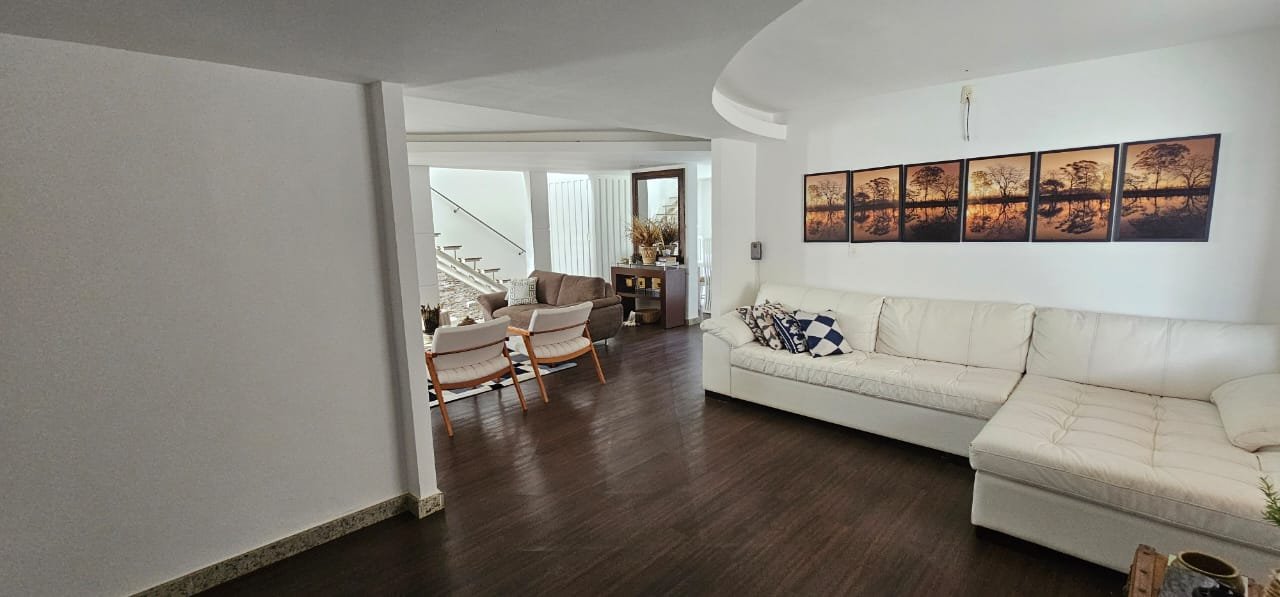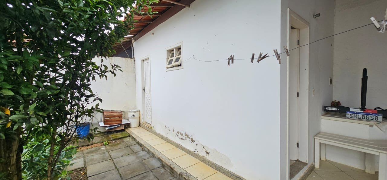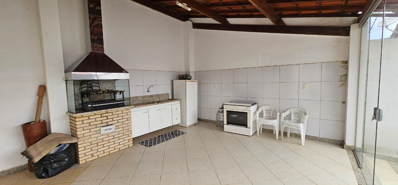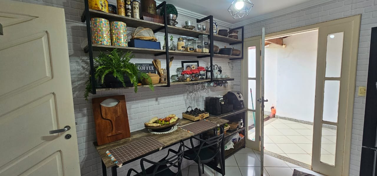 03 salas amplas, 03 sanitários, 03 quartos sendo 01 suíte, todos com armários, cozinha com armários, garagem para 05 carros, área de lazer, 01 sauna, varanda, jardins com frutas e flores.