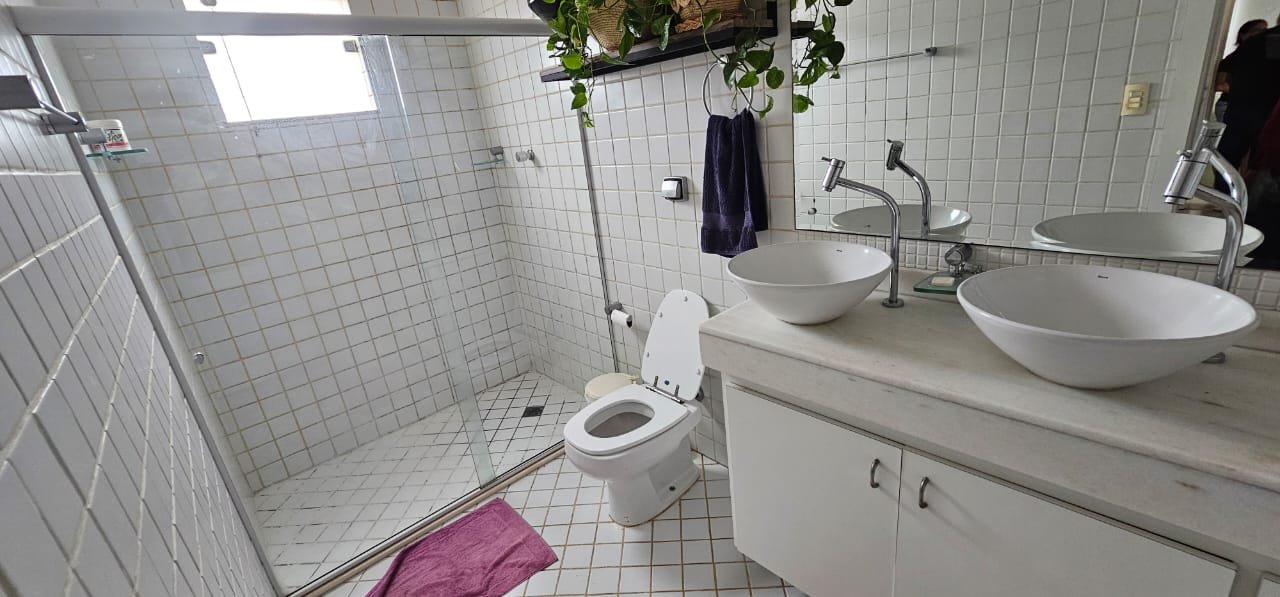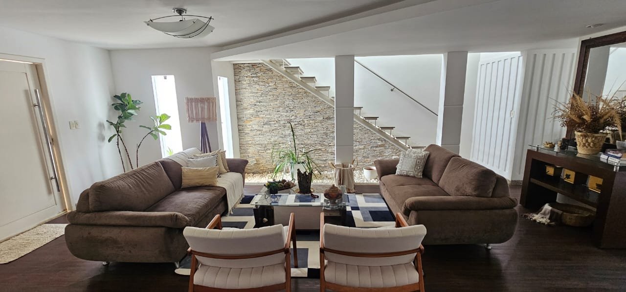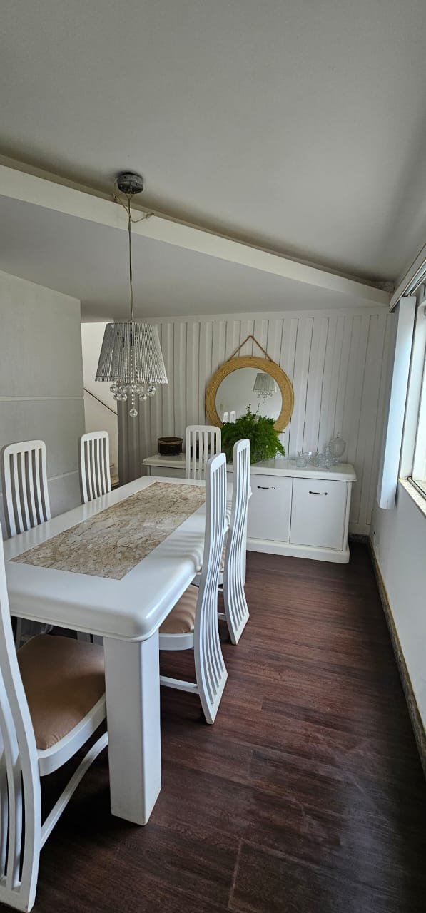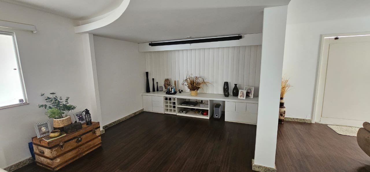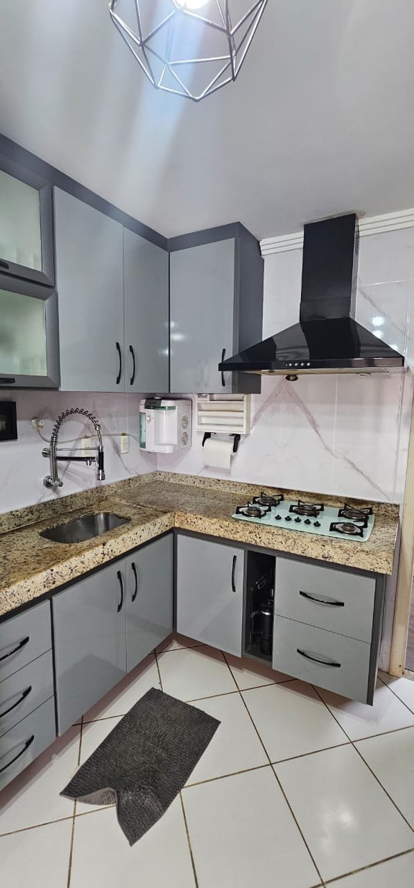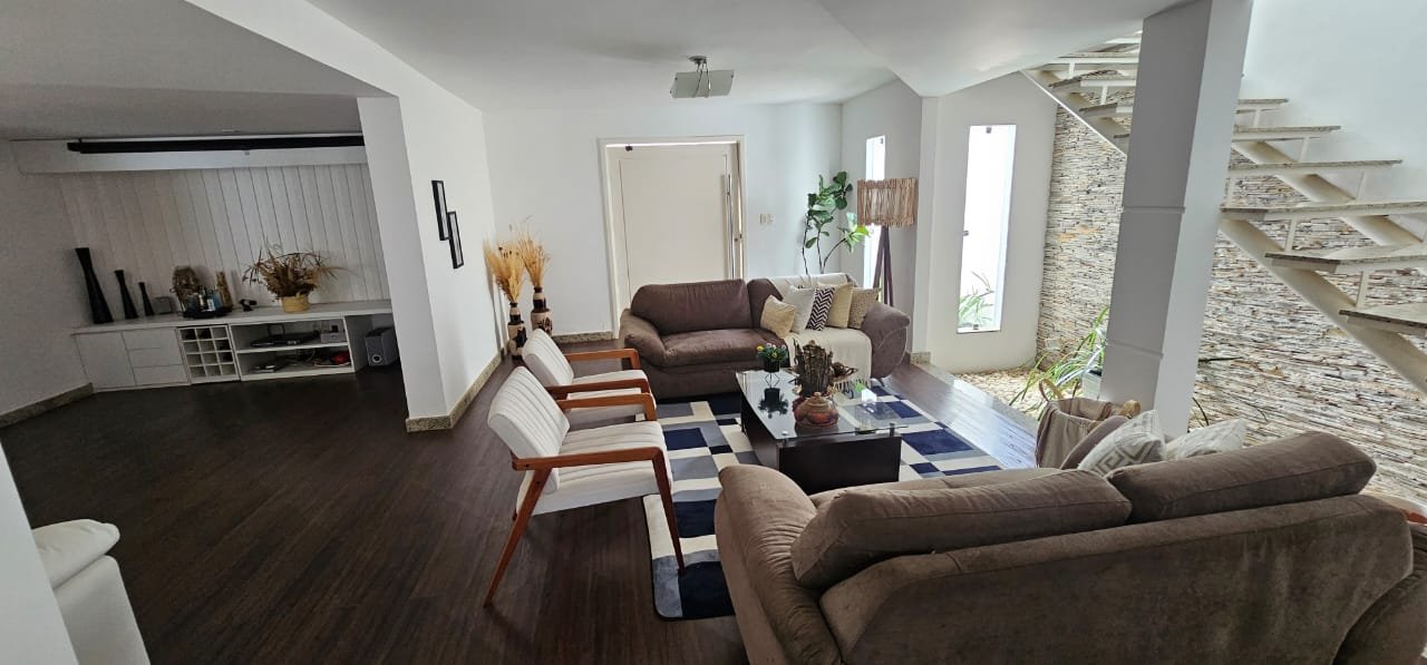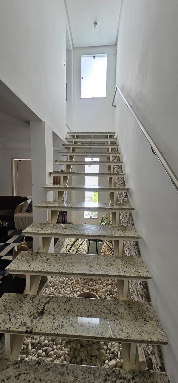03 salas amplas, 03 sanitários, 03 quartos sendo 01 suíte, todos com armários, cozinha com armários, garagem para 05 carros, área de lazer, 01 sauna, varanda, jardins com frutas e flores.